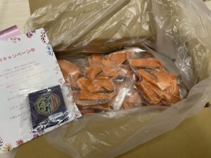 箱を開けた瞬間、きれいなオレンジ色のサーモンが8パックぎっしり!