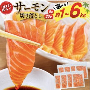 宮城県気仙沼市のふるさと納税返礼品「訳あり刺身用サーモン切り落とし1kg(125g×8パック)」は、サイズや形が不揃いな訳あり品ながら、新鮮で使い勝手抜群!高コスパ食材です。
