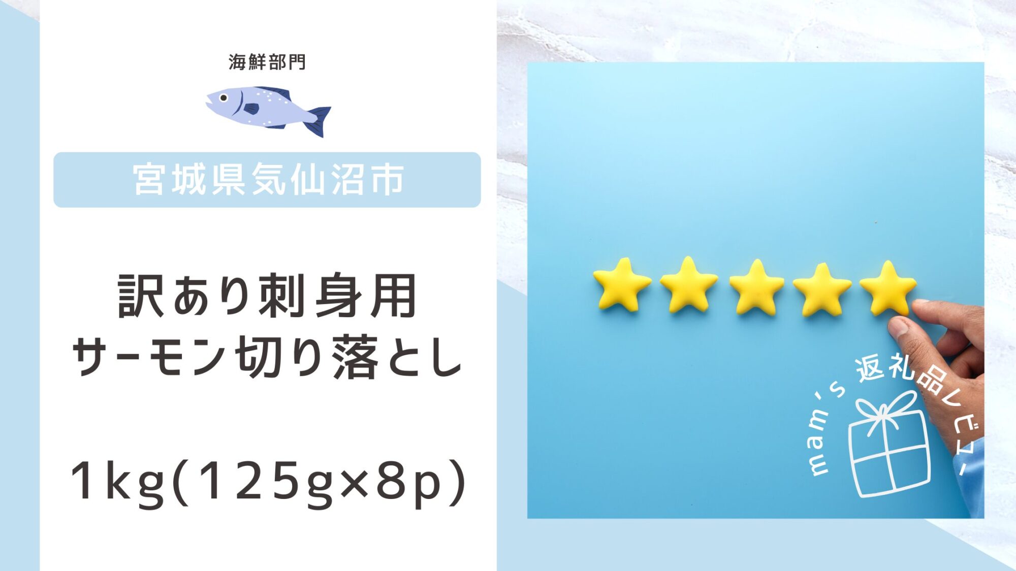 宮城県気仙沼市のふるさと納税返礼品「訳あり刺身用サーモン切り落とし1kg(125g×8パック)」は、サイズや形が不揃いな訳あり品ながら、新鮮で使い勝手抜群!高コスパ食材です。